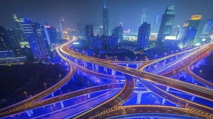From a high viewpoint viewing overpass panoramic pattern, both lane side line outline, but also the green space within the light composition and light sculpture, and the bridge area street light formation of bright lines, these lighting elements together, forming an organic overall picture.